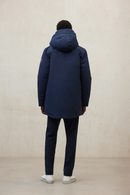 El abrigo Parko es una prenda técnica y comprometida, diseñada para ofrecer protección frente al mal tiempo sin renunciar a la sostenibilidad. Su tejido principal combina 58% poliéster reciclado Hilo del Mar, fabricado a partir de residuos plásticos recogidos del océano, y 42% poliéster reciclado Tex2Tex, proveniente de restos textiles. Una fórmula innovadora que da nueva vida a materiales desechados, evitando su llegada a vertederos o incineradoras.