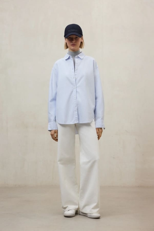 La Camisa Elena blanca de rayas es una prenda imprescindible que combina el encanto de lo clásico con la responsabilidad ambiental. Su diseño de rayas finas en azul cielo sobre fondo blanco transmite frescura y elegancia atemporal, mientras que su confección con algodón reciclado la convierte en una opción respetuosa con el planeta. Ideal para el día a día, tanto en looks informales como en estilos más cuidados.