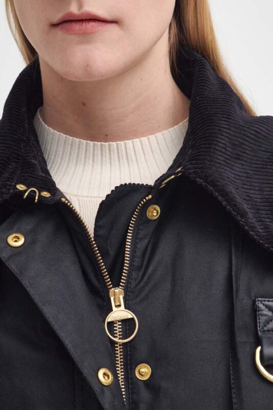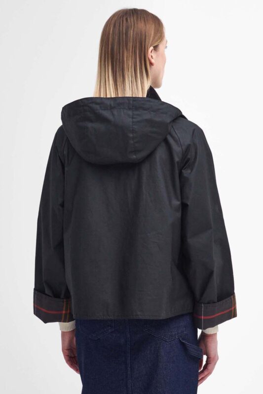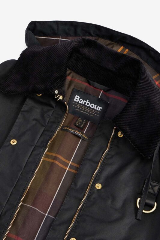 Chaqueta Reighton Wax color negro de Barbour mujer. Chaqueta encerada inspirada en la clásica chaqueta Spey confeccionada en algodón encerado. Cierre central con cremallera con tirador de emblemática anilla Barbour oculta por tapeta abotonada con corchetes. Dispone de capucha fija y cuello de gran tamaño en tejido de pana. Anilla en forma de D característico del modelo Spey en el pecho. Bolsillos frontales tipo parche con solapa abotanada. Logotipo de la marca bordado en la tapeta del bolsillo izquierdo. Detalle de ribete en estampadao clásico tartán de Barbour en los puños. Elige entre la gama de colores distintos disponibles.