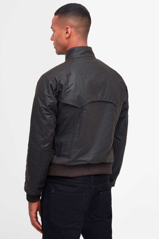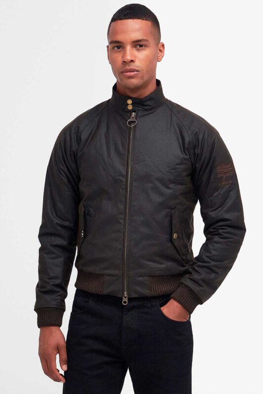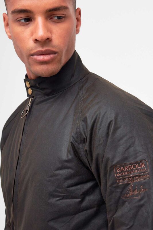 Chaqueta estilo bomber Merchant verde oliva perteneciente a la colección Steve McQueen con acolchado interior y encerado exterior. Una imagen del mítico actor en el interior y los automáticos de los bolsillos con la bandera americana hacen de esta prenda un auténtico tributo a la memoria del motorista.