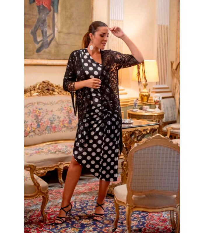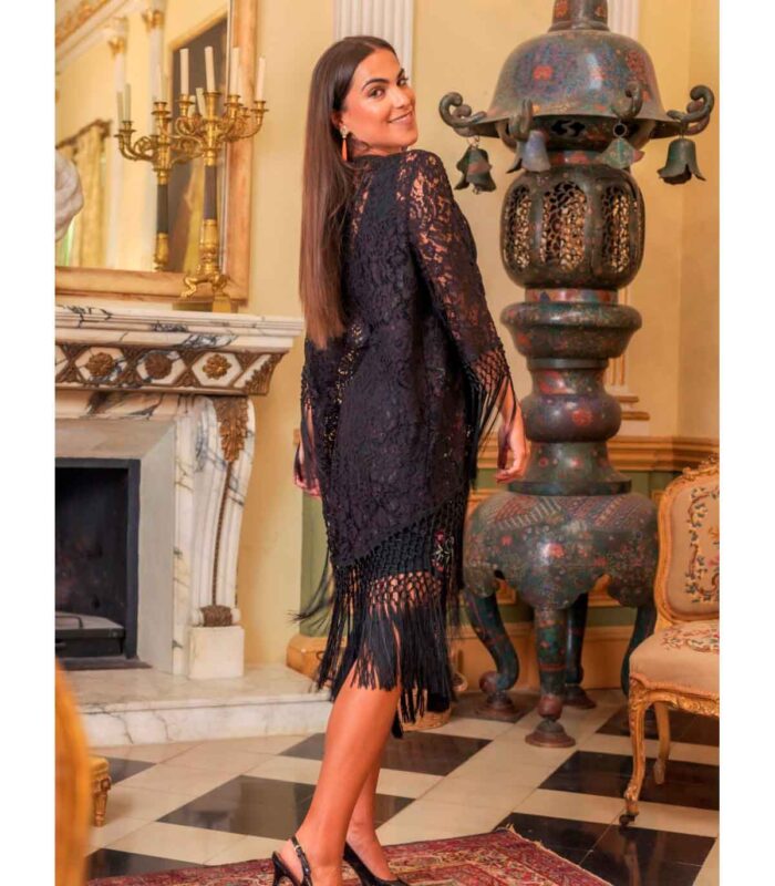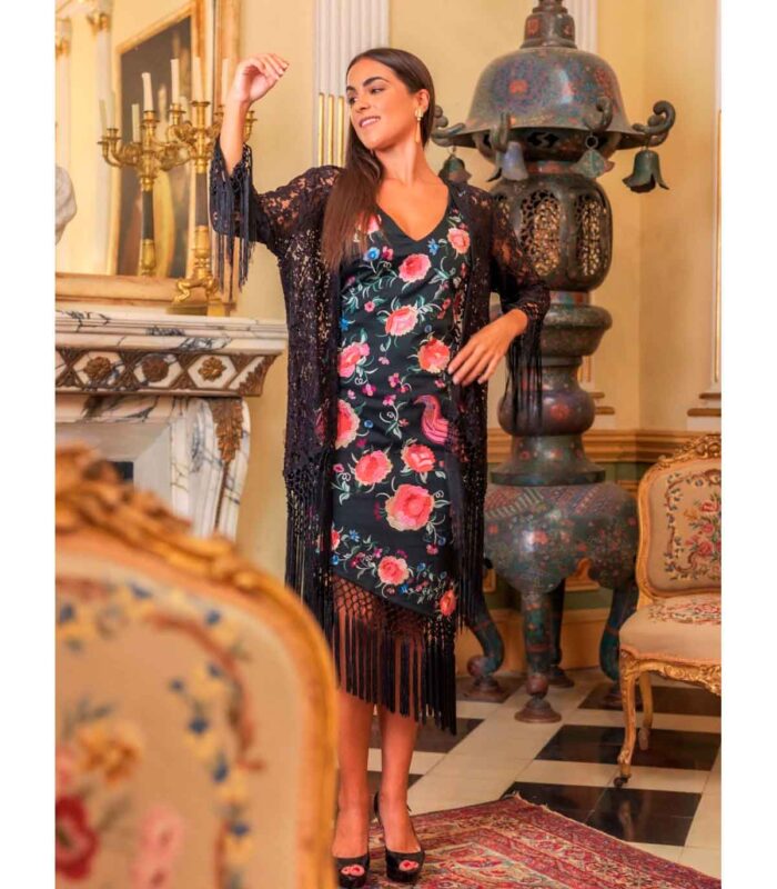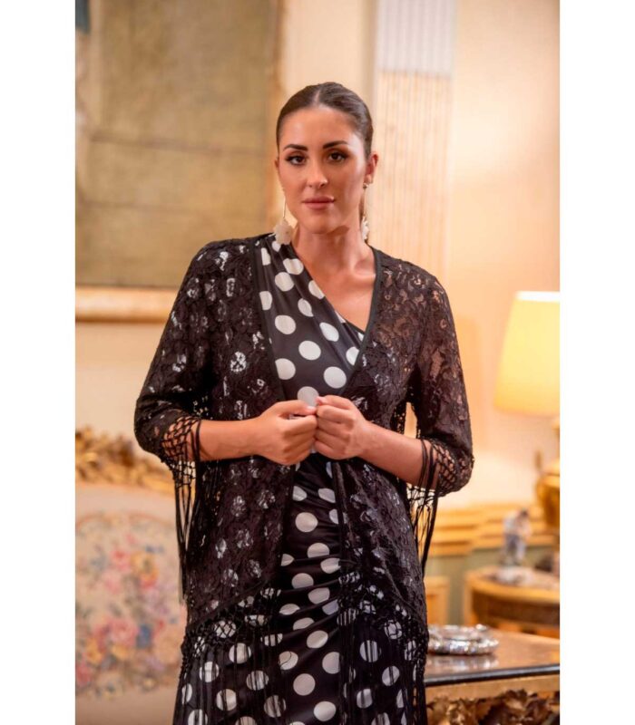 Chaqueta rumba de encaje negro con manga. forma de mantón con flecos en el filo al tono.