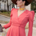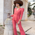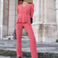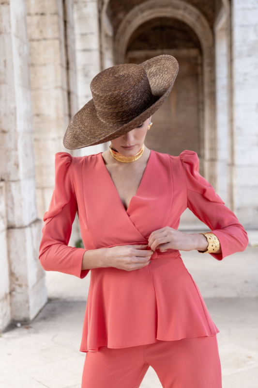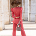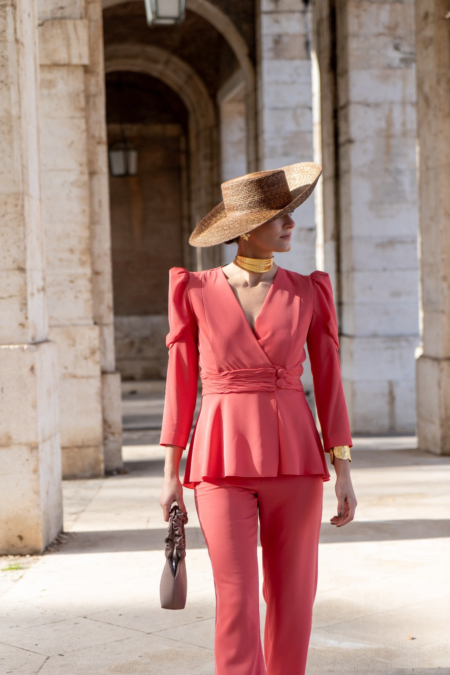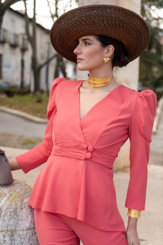 Este conjunto está compuesto por una chaqueta cruzada con cierre de botones y manga larga abullonada, un detalle que aporta volumen equilibrado y eleva el estilo del conjunto. El pantalón, de tiro alto, cuenta con cremallera lateral, lo que ayuda a mantener una línea limpia en la parte frontal y favorece un ajuste más estético. El color coral añade un toque luminoso y distintivo, perfecto para destacar con elegancia tanto de día como de tarde.