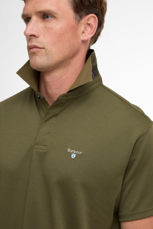 Este modelo presenta cuello clásico con tapeta y botón superior visible, un acabado tradicional que aporta estructura al conjunto. En el interior del cuello incorpora un ribete con estampado clásico tartán Barbour, un detalle sutil que suma personalidad sin resultar excesivo. En el pecho, a la izquierda, luce el logotipo y escudo de la marca bordado en tono contraste, reforzando el carácter auténtico del diseño. Su patrón de manga corta lo convierte en una prenda práctica y versátil, pensada para el uso diario.
