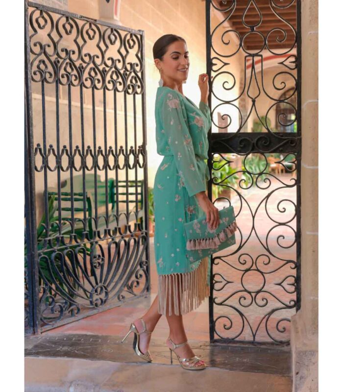 Vestido alegría verde agua bordado sutil mantón en beige, cruzado drapeado de gasa con flecos beige al filo y manga francesa