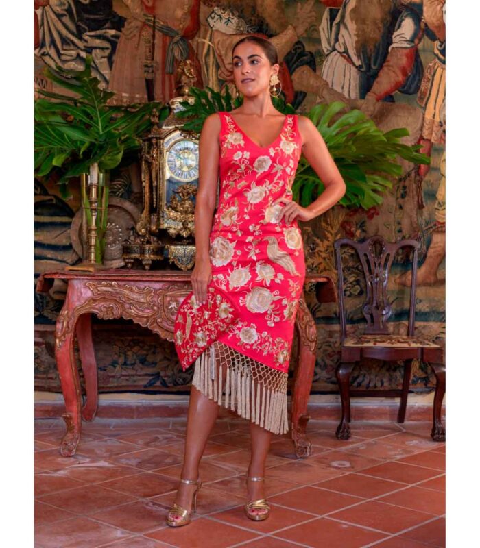 Vestido bulería coral de algodón lycra bordado con motivos florales de mantón en tonos beige y crudo, sin mangas y escote de pico el bajo terminado asimétrico con flecos beige.